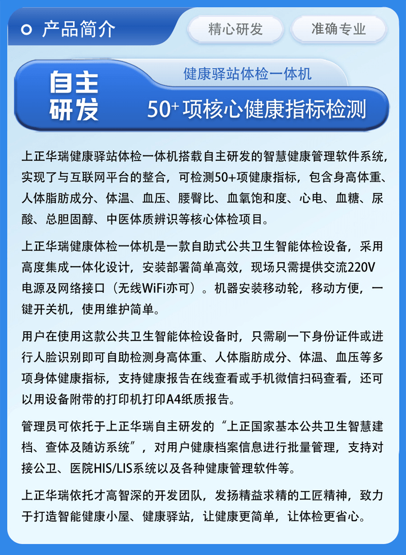 智能健康小站/一站式自助體檢機(jī)/學(xué)生體檢機(jī)/老人體檢機(jī)-上正華瑞產(chǎn)品說明: