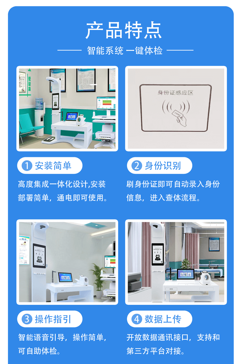 2.?智能化:上正華瑞智能健康小站采用先進(jìn)的人工智能技術(shù),能夠自動(dòng)識(shí)別用戶身份,自動(dòng)檢測用戶的健康狀況,并根據(jù)用戶的特定需求提供定制化的健康服務(wù)。這種智能化的設(shè)計(jì)使得體檢過程更加高效、準(zhǔn)確。