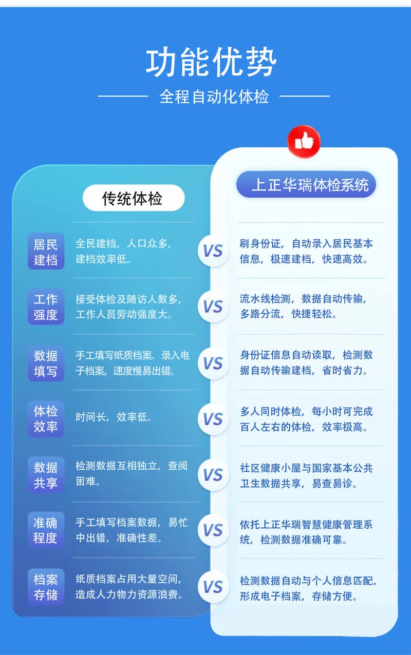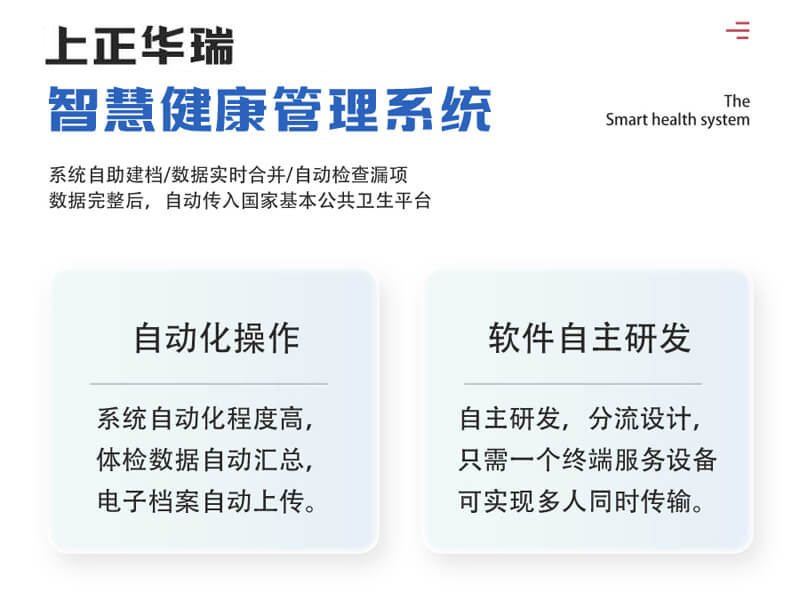 上正華瑞公共衛(wèi)生體檢系統(tǒng)通過(guò)其自動(dòng)化、信息化、智能化的功能優(yōu)勢(shì),不僅提高了公共衛(wèi)生服務(wù)的效率和質(zhì)量,還為居民提供了更加便捷、個(gè)性化的健康管理服務(wù)。