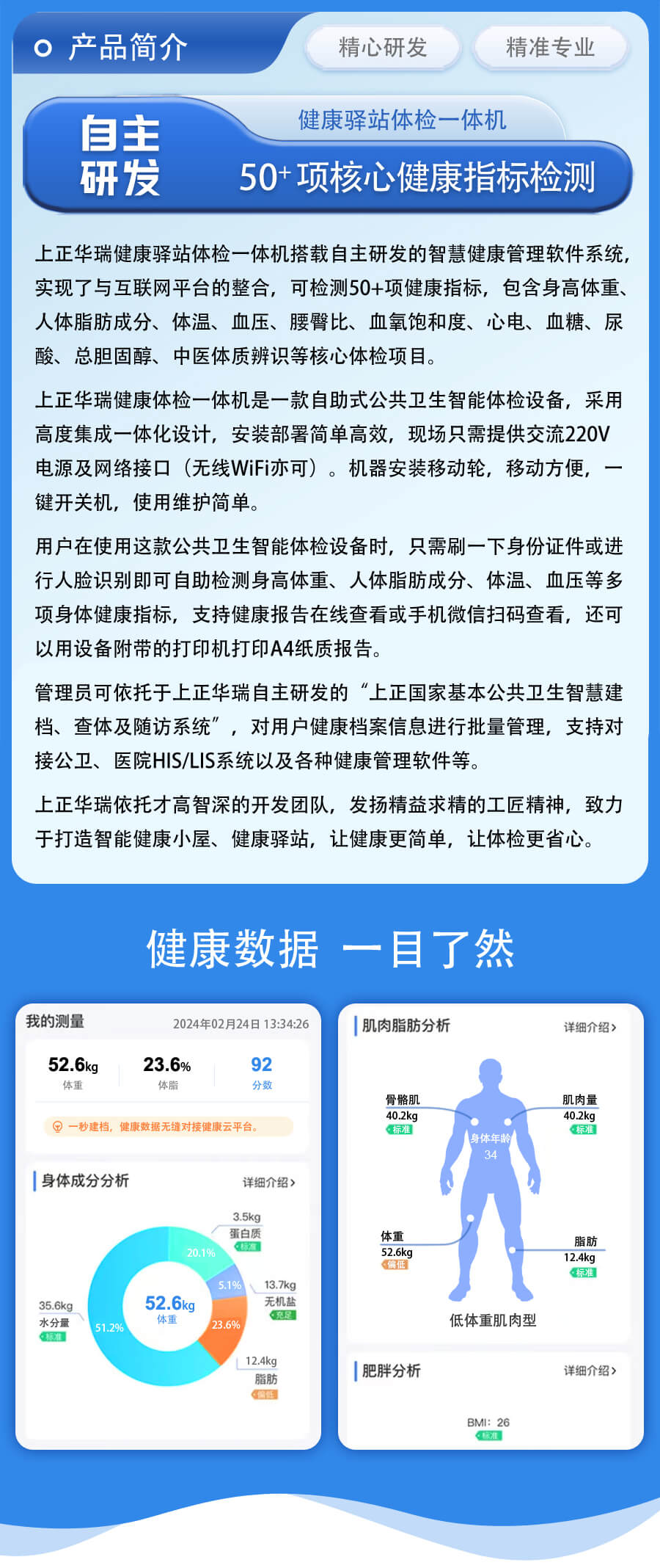 此外,上正華瑞健康體檢一體機(jī)還具有數(shù)據(jù)準(zhǔn)確、操作簡便的特點(diǎn)。由于采用自動化技術(shù)進(jìn)行測量,避免了人工操作的誤差,使得體檢數(shù)據(jù)更加準(zhǔn)確可靠。同時,一體機(jī)通常采用觸摸屏操作,界面簡單明了,即使是老年人也能輕松操作。這降低了操作難度,提高了查體工作的便捷性。