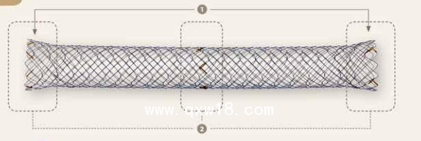產(chǎn)品由預(yù)裝支架和推送器組成,推送器包括內(nèi)窺鏡用推送器和放射科用推送器,推送器的由外鞘、內(nèi)鞘、內(nèi)軸、內(nèi)管、射線不透性標(biāo)識物頂頭、重新定位塊、射線不透性標(biāo)識物、外鞘手柄、內(nèi)軸手柄和內(nèi)窺鏡標(biāo)識物(僅內(nèi)窺鏡用推送器包含)組成。支架由鎳鈦合金絲編織成圓柱狀。