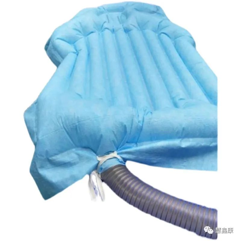 該產(chǎn)品使用簡單,只要將升溫毯有標(biāo)記面覆裹在患者非手術(shù)區(qū)域,設(shè)置好充氣升溫裝置的溫度,輸出的暖風(fēng)經(jīng)輸氣軟管充入升溫毯內(nèi)。暖風(fēng)在毯子的多通道內(nèi)流轉(zhuǎn),通過毯子內(nèi)層微孔噴出,在患者的體表形成有效的保暖層,暖風(fēng)從人體外圍向機(jī)體提供熱量,通過血液循環(huán)達(dá)到升溫,保暖功能。