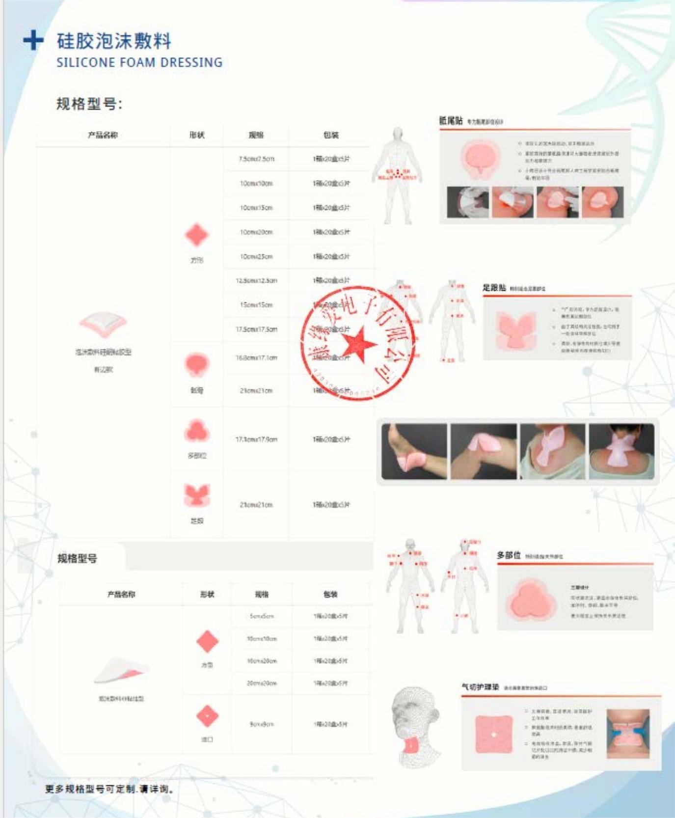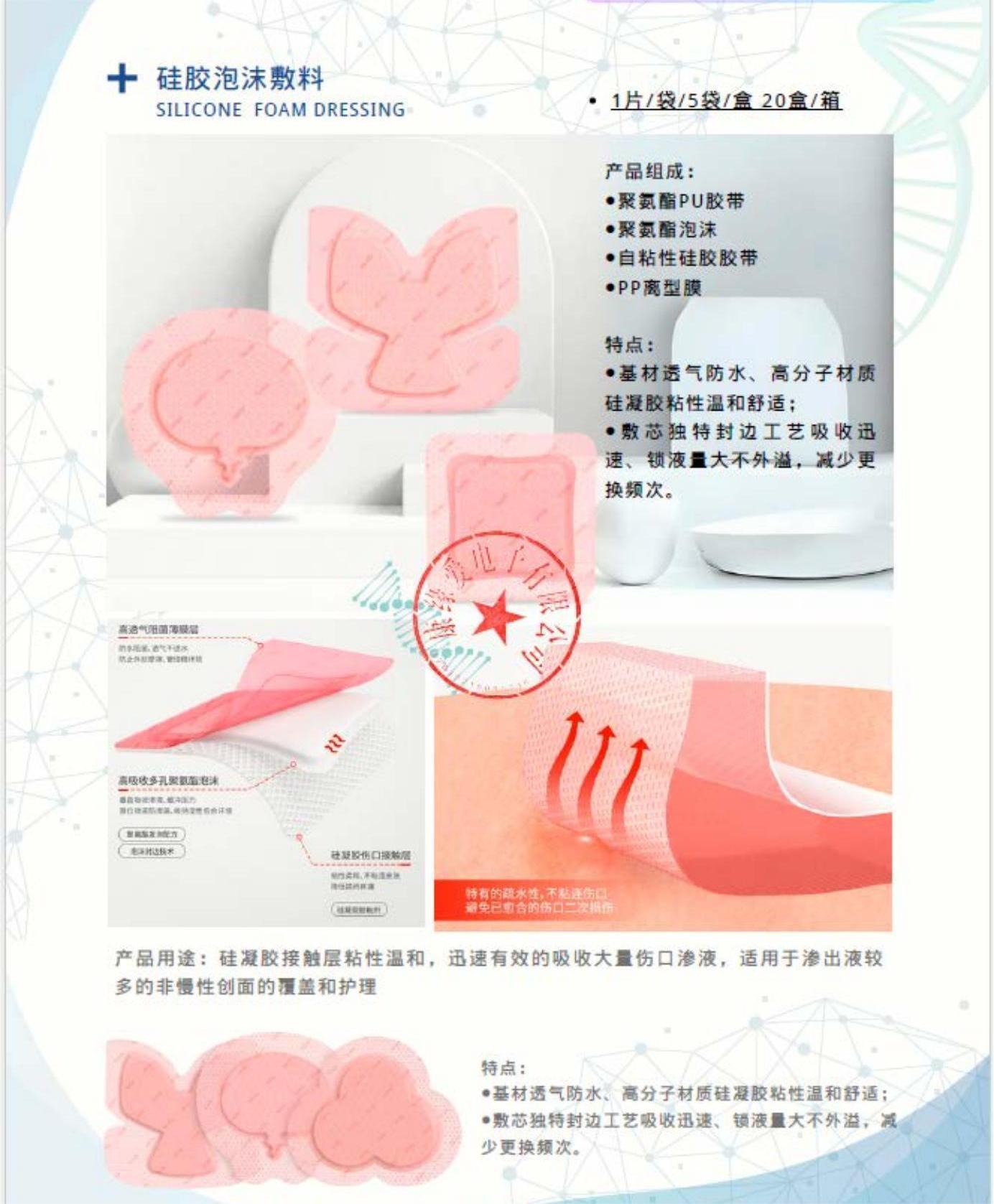 硅凝膠泡沫敷料由聚氨酯PU膠帶、聚氨酯泡沫、自粘性硅膠膠帶、PP離型膜制作而成,其中聚氨酯PU膠帶為涂醫(yī)用壓敏膠的聚氨酯薄膜,自粘性硅膠膠帶為涂醫(yī)用壓敏膠和硅凝膠的聚氨酯薄膜,離型膜為涂硅油防粘劑的PP膜;所含成分不可被人體吸收,環(huán)氧乙烷滅菌,一次性使用。