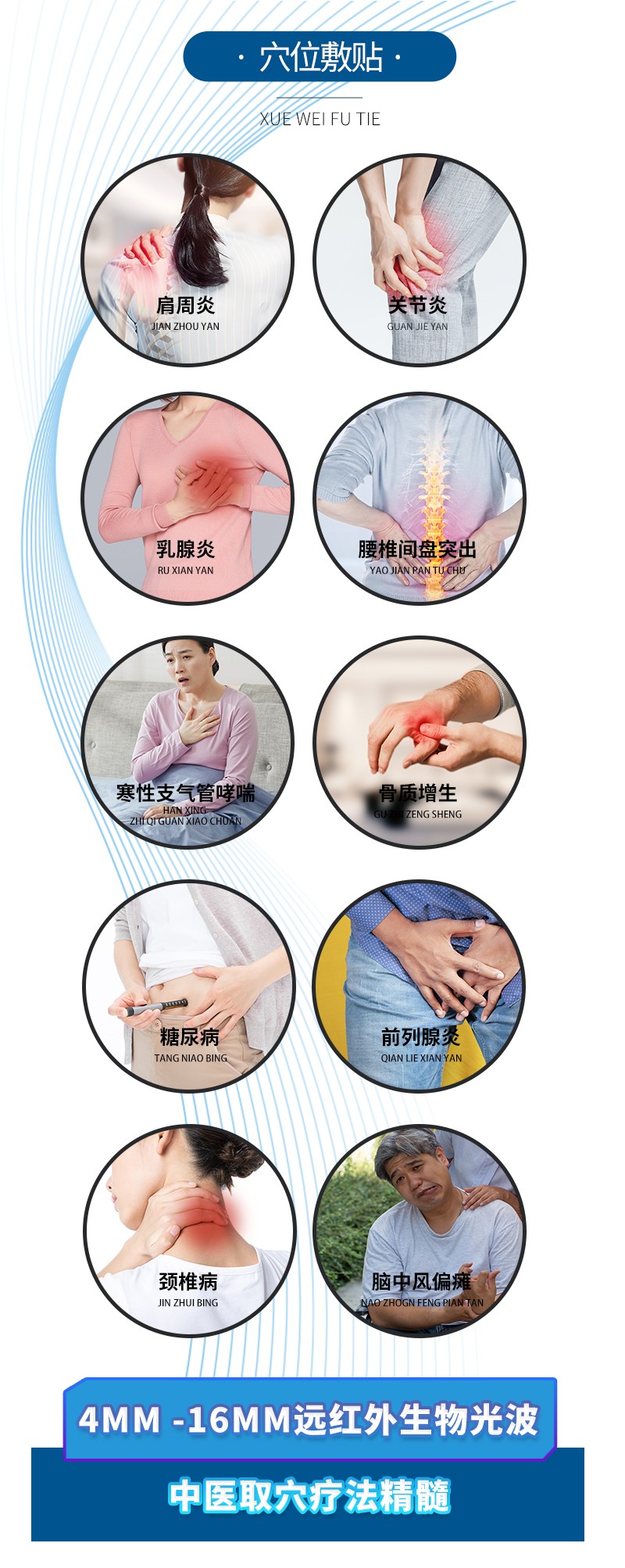 【適用范圍】根據(jù)中醫(yī)取穴療法,適用于頸椎病、肩周炎、腰椎間盤突出、關(guān)節(jié)炎、骨質(zhì)增生、乳腺炎引起的疼痛及寒性支氣管哮喘、糖尿病、前列腺炎的輔助治療,配合臨床對腦中風偏癱進行輔助治療。