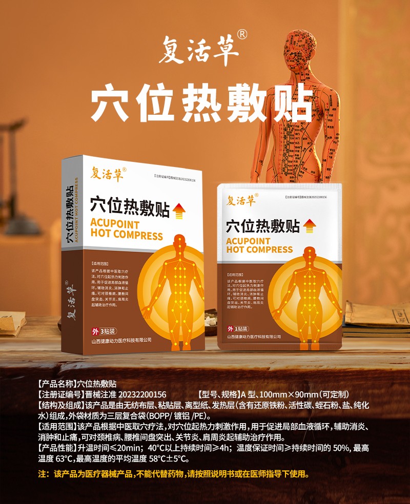 【適用范圍】該產(chǎn)品根據(jù)中醫(yī)取穴療法,對穴位起熱力刺激作用,用于促進局部血液循環(huán),輔助消炎、消腫和止痛,可對頸椎病、腰椎間盤突出、關(guān)節(jié)炎、肩周炎起輔助治療作用。
