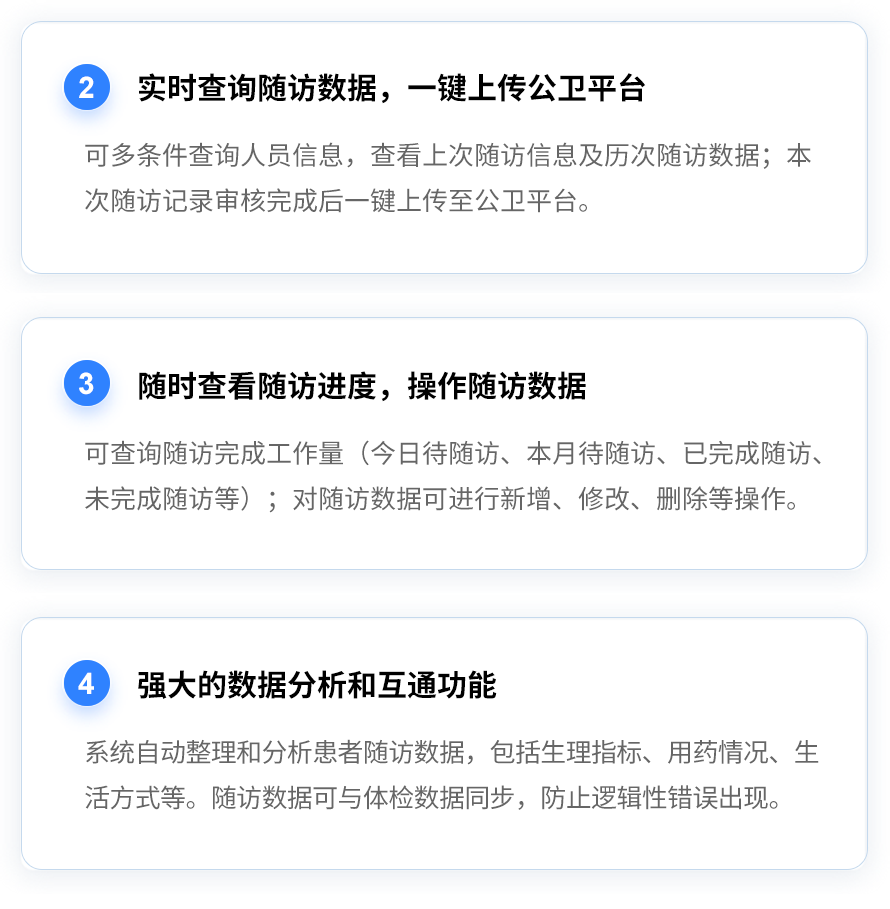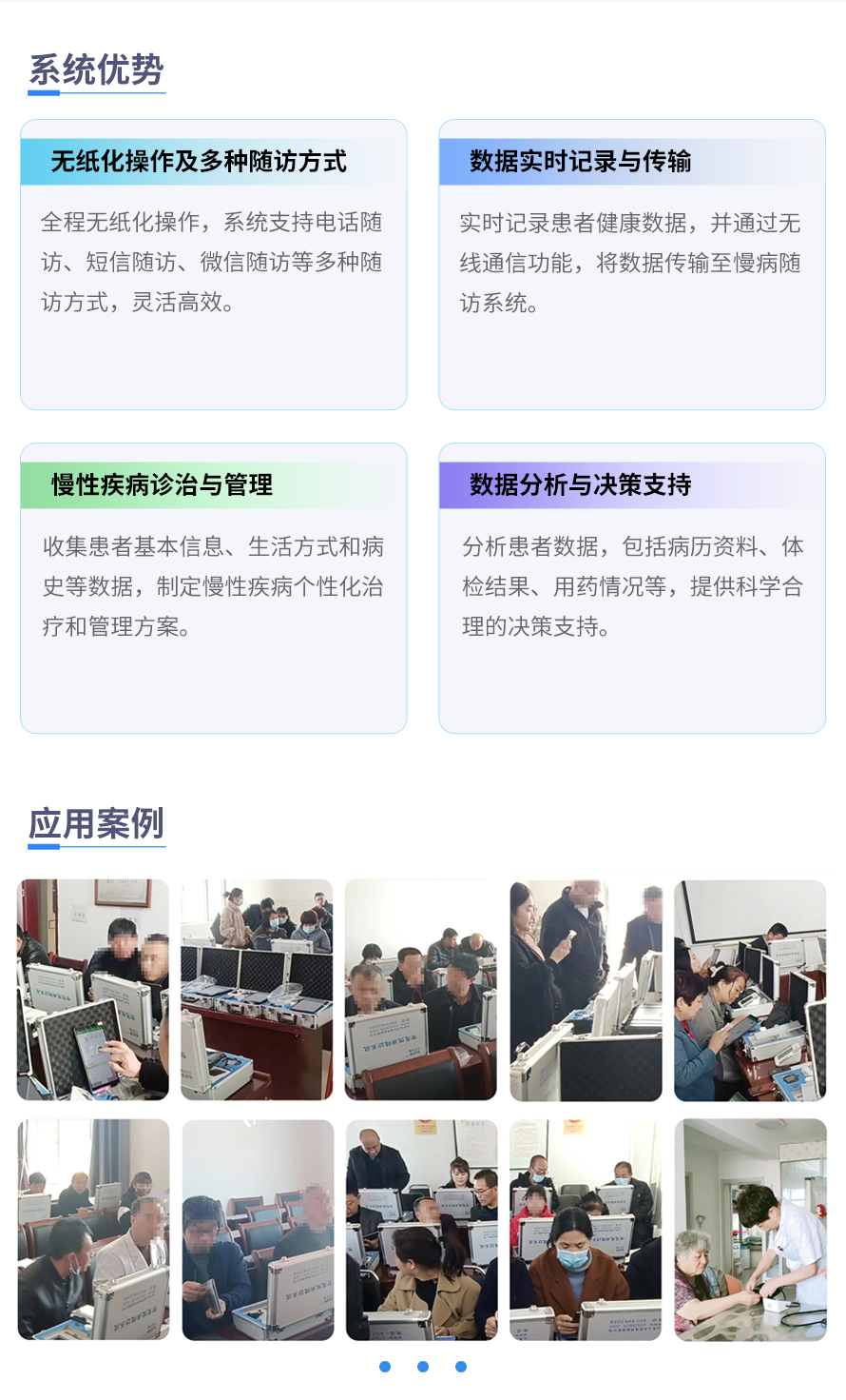 1、高效性:通過自動化和智能化的功能,如自動數(shù)據(jù)上傳、存儲和分析,以及智能化的提醒和預(yù)警功能,上正華瑞公衛(wèi)慢病隨訪系統(tǒng)顯著提高了慢病管理的效率。