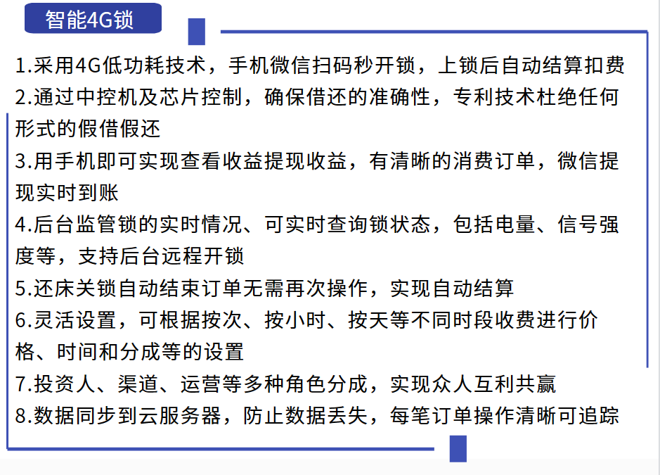 Ⅰ 數(shù)據(jù)傳輸穩(wěn)定,上鎖自動結(jié)束訂單.Ⅱ 一控多,一個主板控制多個鎖頭,高度集成,