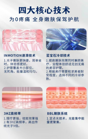 功能:選擇性吸收皮膚黑色素、血紅蛋白,在不損傷正常皮膚組織的前提下,達到祛黑、祛紅的目的。能夠恢復(fù)皮膚彈性,增強血管功能,改善皮膚松弛、淺表皺紋、毛孔粗大。可以脫毛、祛斑、祛紅血絲、改善痤瘡、嫩膚。