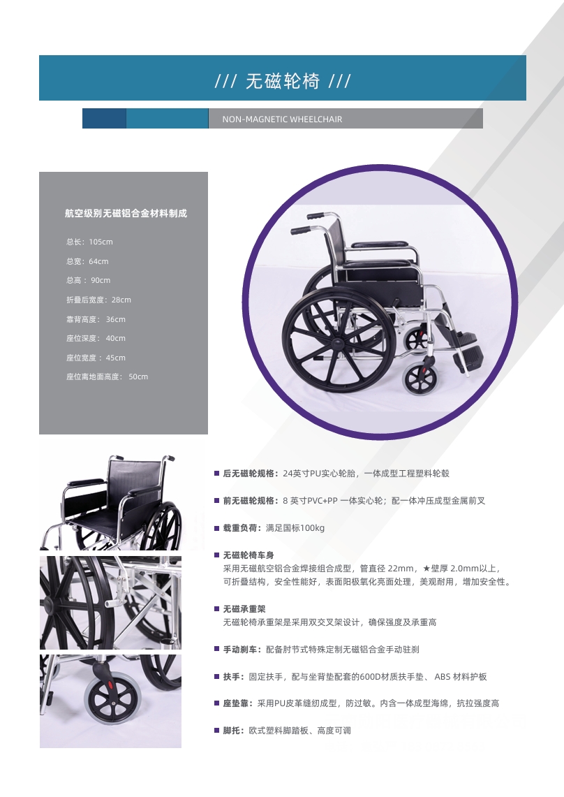 無(wú)磁輪椅是一種主要應(yīng)用于醫(yī)療領(lǐng)域?qū)Υ艌?chǎng)環(huán)境有嚴(yán)格要求場(chǎng)所的特殊輪椅,以下是詳細(xì)介紹: