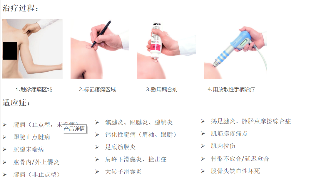 適用范圍:該產(chǎn)品供臨床矯形外科治療骨骼附近軟組織慢性疼痛。其適應癥如下:肩鈣化性肌腱炎、肩峰下疼痛綜合征、網(wǎng)球肘、股骨大轉子疼痛綜合征、髕骨尖綜合征、脛骨結節(jié)骨軟骨炎、脛骨內(nèi)側應力綜合征、插入性跟腱肌腱病、中間體跟腱肌腱病、足底筋膜炎(或足底筋膜病變)、肌筋膜疼痛綜合征(觸發(fā)點治療),特異性腰背疼痛和根性綜合征。