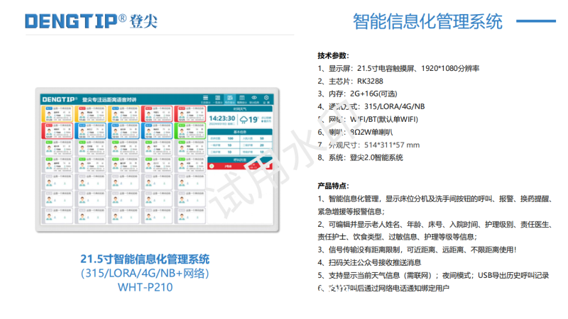 1、智能信息化管理,顯示床位分機(jī)及洗手間按鈕的呼叫、報(bào)警、換藥提醒、緊急增援等報(bào)警信息;