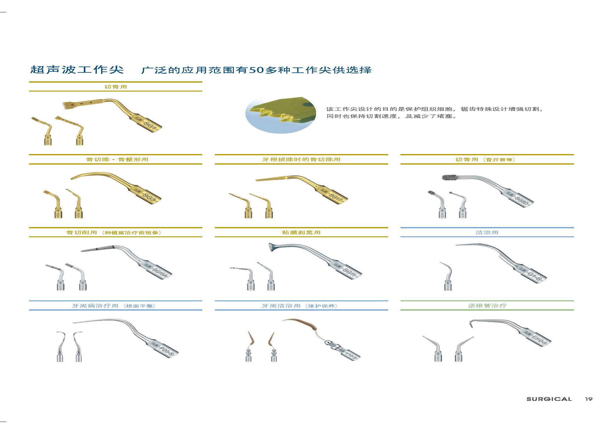 適用范圍:在口腔外科實(shí)施骨手術(shù)、種植手術(shù)時(shí),對(duì)骨部實(shí)施切削、切除、切斷、穿孔;在牙周治療時(shí),去除牙齒表面的牙結(jié)石等沉淀物。