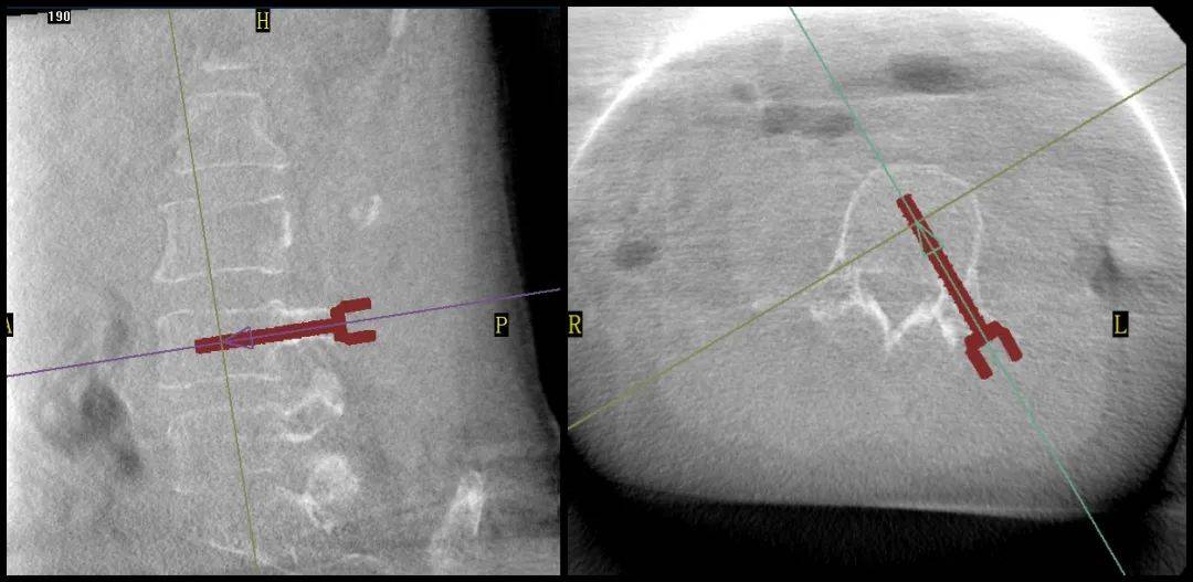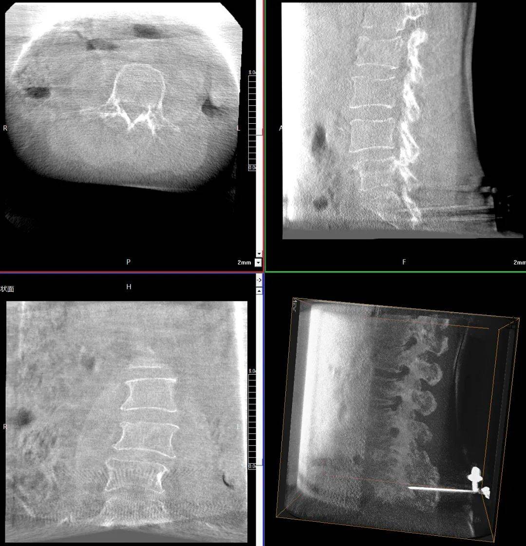 手術過程中,普愛醫(yī)療平板三維C形臂為患者拍攝了清晰的三維影像,醫(yī)生基于影像完成了兩個節(jié)段的穿刺路徑規(guī)劃。