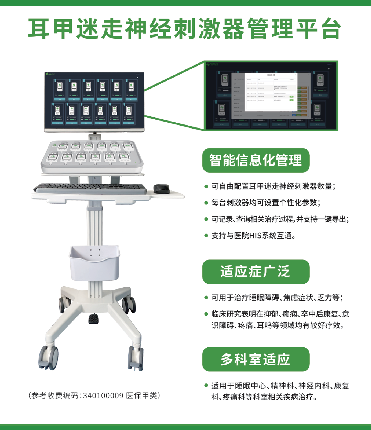 根據(jù)科室需求可自由配置耳甲迷走神經(jīng)刺激器數(shù)量每臺(tái)推車12個(gè)以內(nèi)。