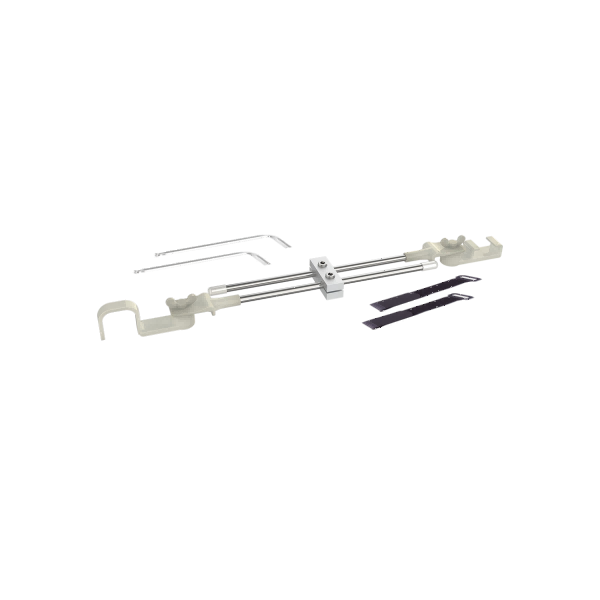 本產(chǎn)品由骨科手術(shù)體位固定架和固定套環(huán)(選配)組成。其中,Ⅰ型體位固定架由固定連桿(支架桿)、調(diào)節(jié)固定夾、固定扣、掛扣、綁帶、內(nèi)六角扳手組成;其中,固定連桿由304不銹鋼和PA制成,調(diào)節(jié)固定夾由鋁合金制成,固定扣和掛扣由PA制成,內(nèi)六角扳手和內(nèi)六角螺栓由304不銹鋼制成,綁帶和螺栓由PA制成。Ⅱ型體位固定架由底座、插銷、內(nèi)調(diào)節(jié)筒、外調(diào)節(jié)筒、萬向球頭、連接塊、下支撐板或上支撐板組成;其中,支撐板、連接塊、內(nèi)調(diào)節(jié)筒/外調(diào)節(jié)筒/插銷、導(dǎo)向塊、底座由ABS制成,萬向球頭和螺絲由鋁合金制成。Ⅲ型體位固定架由三角支撐架、下支撐板或上支撐板組成;其中支撐板由ABS制成,三角支撐架由PP制成。固定套環(huán)由硅橡膠、聚酯纖維和PVC制成。