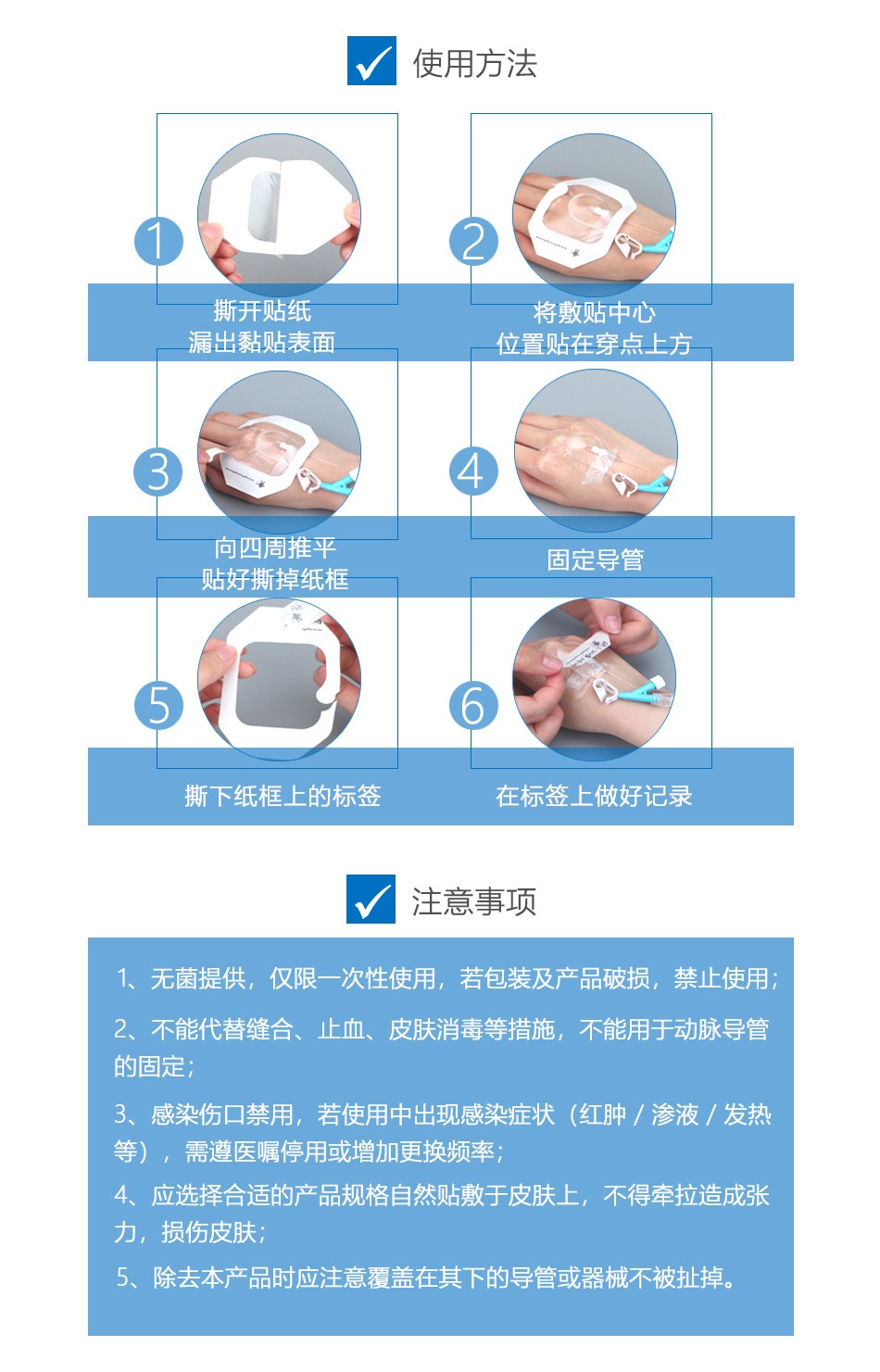 帶敷芯型用于非慢性創(chuàng)面 如淺表性創(chuàng)面、手術(shù)后縫合創(chuàng)面、機(jī)械創(chuàng)傷、小創(chuàng)口、擦傷、切割傷創(chuàng)面、穿刺器械的穿刺部位、I度或淺II度的燒燙傷創(chuàng)面、嬰兒肚臍口創(chuàng)口、激光/光子/果酸換膚/微整形術(shù)后創(chuàng)面)的護(hù)理,為創(chuàng)面愈合提供微環(huán)境。無(wú)敷芯型用于對(duì)穿刺器械(如導(dǎo)管)的穿刺部位的護(hù)理并固定穿刺器械。