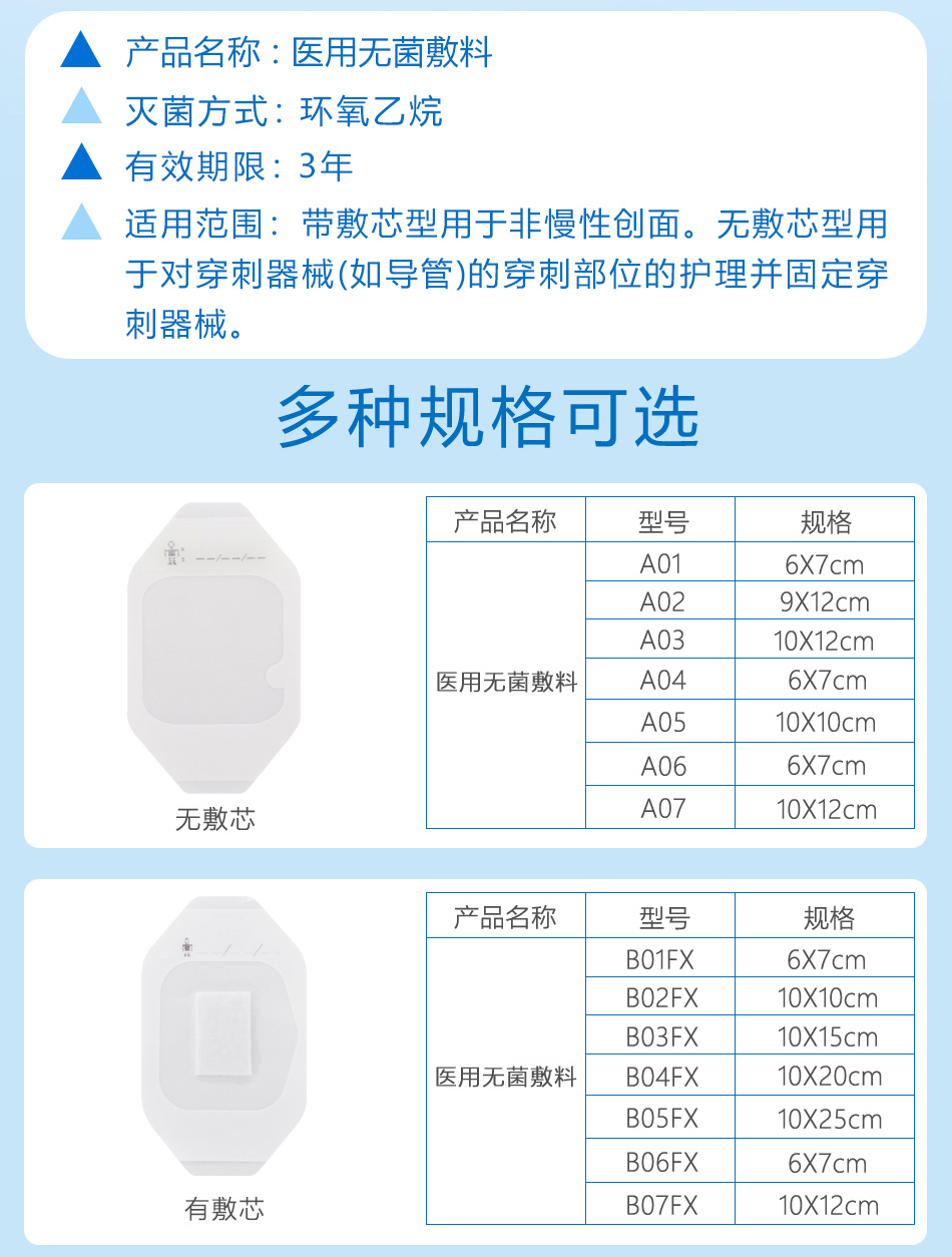 帶敷芯型用于非慢性創(chuàng)面 如淺表性創(chuàng)面、手術(shù)后縫合創(chuàng)面、機(jī)械創(chuàng)傷、小創(chuàng)口、擦傷、切割傷創(chuàng)面、穿刺器械的穿刺部位、I度或淺II度的燒燙傷創(chuàng)面、嬰兒肚臍口創(chuàng)口、激光/光子/果酸換膚/微整形術(shù)后創(chuàng)面)的護(hù)理,為創(chuàng)面愈合提供微環(huán)境。無(wú)敷芯型用于對(duì)穿刺器械(如導(dǎo)管)的穿刺部位的護(hù)理并固定穿刺器械。