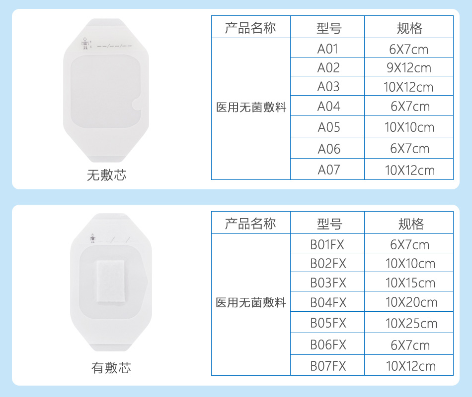 帶敷芯型用于非慢性創(chuàng)面 如淺表性創(chuàng)面、手術(shù)后縫合創(chuàng)面、機(jī)械創(chuàng)傷、小創(chuàng)口、擦傷、切割傷創(chuàng)面、穿刺器械的穿刺部位、I度或淺II度的燒燙傷創(chuàng)面、嬰兒肚臍口創(chuàng)口、激光/光子/果酸換膚/微整形術(shù)后創(chuàng)面)的護(hù)理,為創(chuàng)面愈合提供微環(huán)境。無(wú)敷芯型用于對(duì)穿刺器械(如導(dǎo)管)的穿刺部位的護(hù)理并固定穿刺器械。