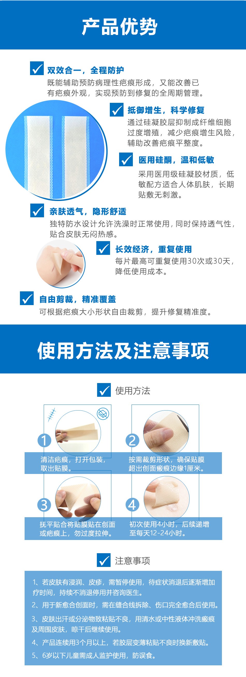 用于輔助改善皮膚病理性疤痕,輔助預防皮膚病理性疤痕的形成,不用于未愈合的傷口。