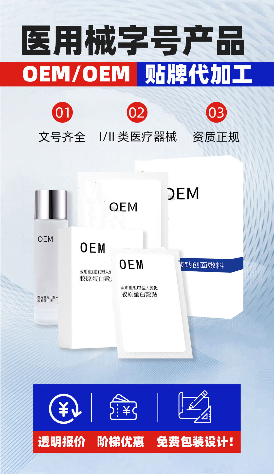 在貼牌代加工業(yè)務(wù)上,公司針對膠原蛋白敷料貼、醫(yī)用修復(fù)敷料等產(chǎn)品提供一站式定制服務(wù),可滿足客戶從成分配方研發(fā)、基材選型、規(guī)格定制、無菌包裝設(shè)計到合規(guī)備案、批量生產(chǎn)的全流程需求。配備專業(yè)技術(shù)團(tuán)隊與合規(guī)顧問,靈活適配不同訂單規(guī)模,支持免費(fèi)打樣、快速出貨,助力合作伙伴快速推出市場競爭力強(qiáng)的產(chǎn)品。公司始終堅守“品質(zhì)為先、無菌安全、合作共贏”的經(jīng)營理念,賦能醫(yī)用肌膚修復(fù)領(lǐng)域發(fā)展。