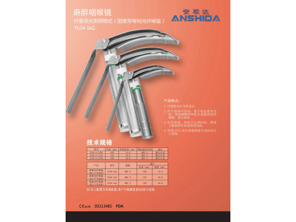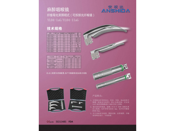 產(chǎn)品說明:麻醉咽喉鏡YL04-IaG(可拆卸光纖喉鏡)產(chǎn)品適用范圍:該產(chǎn)品用于手術(shù)開始前的麻醉、插管和復(fù)蘇,在插管過程中用喉鏡,可清楚觀察