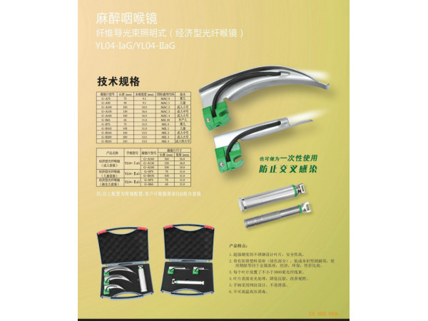 產(chǎn)品說明:麻醉咽喉鏡YL04-IaG(經(jīng)濟(jì)型光纖喉鏡)產(chǎn)品適用范圍:該產(chǎn)品用于手術(shù)開始前的麻醉、插管和復(fù)蘇,在插管過程中用喉鏡,可清楚觀察