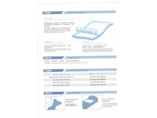產(chǎn)品說明:一次性使用醫(yī)用護(hù)理墊是一種由無紡布、絨毛漿(衛(wèi)生紙)、高分子吸收樹脂、PE膜等材料制成的一次性衛(wèi)生用品。一次性使用醫(yī)用護(hù)理
